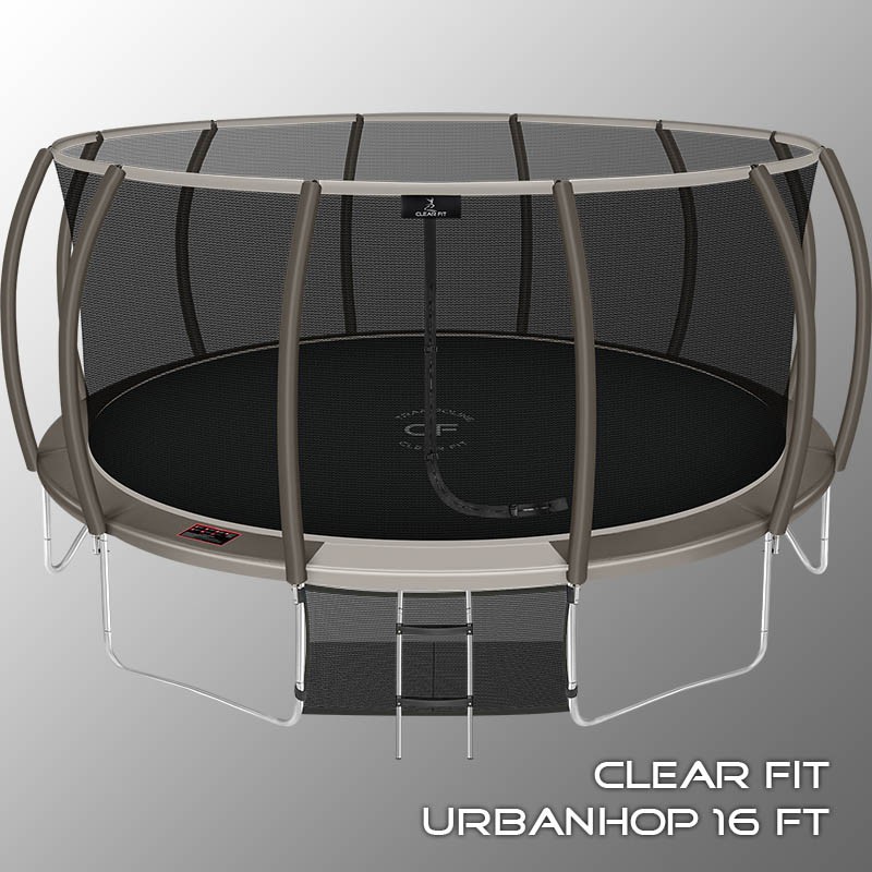 В 2026 году представлена обновленная линейка с улучшенной конструкцией каркаса. Усиление достигнуто за счет использования прочных Т-образных кронштейнов из металла толщиной 1.9 мм. Кроме того, в комплектацию добавлен карман для обуви. Каркасный батут с защитной сеткой Clear Fit серии UrbanHop — отличаются комфортом и надежностью. Надежная рама из качественных комплектующих, прочная защитная сеть снабжена прямым креплением к прыжковому полотну и дополнительной защитой входа, наверху каркасное жесткое крепление, сеть не провисает и не слетает во время тренировок. Увлекательный, полезный и безопасный тренажер для всей семьи. Батуты серии UrbanHop 10Ft, 12Ft, 14Ft и 16Ft поставляются в оптимальной для комфорта и безопасности комплектации: батут, верхняя защитная сеть, защитный мат, лестница и карман для обуви. Батут размером в 16 футов с прыжковой поверхностью 4.38 м идеально подходит для пользователей любого возраста и физической подготовки, размеры позволяют комфортно тренироваться взрослым и развлекаться детям, включая подростков и спортсменов. Верхняя защитная сеть оберегает от падений, усиленная молния и дополнительная защита входа уберегут малышей от случайного входа или падения. Надежный каркас из оцинкованной стали, качественные комплектующие и погодостойкие гальванизированные метизы рамы делают батут безопасным, устойчивым, надежным, гарантируют полную защиту от коррозии и долгий срок службы. Качественные материалы и мощная рама батута UrbanHop 16Ft предусматривают эксплуатацию с нагрузкой до 300 кг.