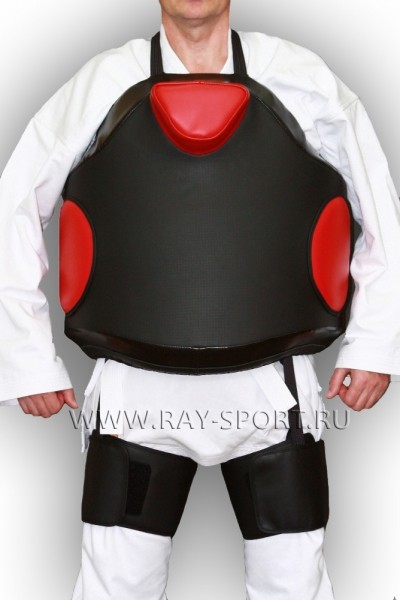 Демпфирующий вкладыш из сочетания пенополиэтилена толщиной 5 см (плотностью 30 кг/м³) и пенополиуретана 3 см (плотностью 25 кг/м³) надёжно защищает грудную клетку, боковые части туловища при ударах руками и ногами в полную силу.